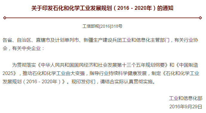 關(guān)于印發(fā)石化和化學工業(yè)發(fā)展規(guī)劃(2016-2020年)的通知工信部規(guī)[2016]318號各省、自治區(qū)、直轄市及計劃單列市、新疆生產(chǎn)建設(shè)兵團工業(yè)和信息化主管部門,有關(guān)行業(yè)協(xié)會,有關(guān)中央企業(yè):為貫徹落實《中華人民共和國國民經(jīng)濟和社會發(fā)展第十三個五年規(guī)劃綱要》和《中國制造2025》,推動石化和化學工業(yè)由大變強,指導(dǎo)行業(yè)持續(xù)科學健康發(fā)展,制定《石化和化學工業(yè)發(fā)展規(guī)劃(2016-2020…